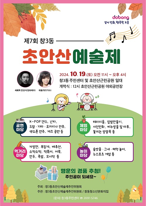 도봉구(구청장 오언석) 창3동이 10월 19일 초안산근린공원 일대에서 「제7회 창3동 초안산예술제」를 개최한다.