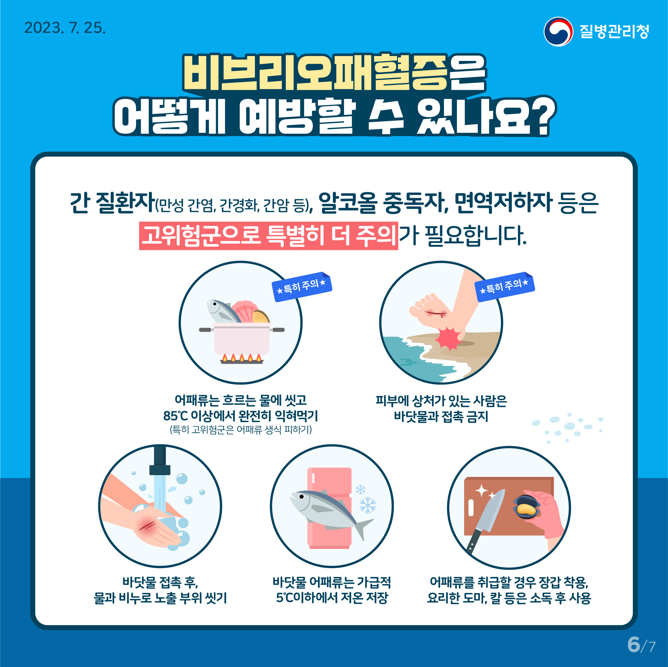 질병관리청(청장 지영미)은 5월 10일(토) 비브리오패혈증 올해 첫 환자가 발생함에 따라 비브리오패혈증 예방을 위해 각별한 주의를 당부하였다.