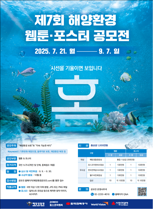 해양경찰청(청장 김용진)은 기후 위기 등 해양환경 문제를 인식하고 협업기관*의 실현을 위해 「제7회 해양환경 웹툰·포스터 공모전」을 오는 7월 21일부터 9월 7일까지 개최한다고 밝혔다.